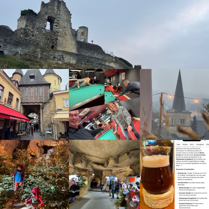 In december nog lekker een paar daagjes samen er tussenuit geweest naar Limburg. In een hotelletje handig tussen Valkenburg en Maastricht. Naast kerstmarkt in de grotten, het museum of illusions, bezok aan het fort, terrasjes, hapje, drankje, ff poolen en winkelen in Maastricht ook heerlijk gelopen in de limburgse heuvels rond het Geuldal. Aansluitend doorgereden naar vrienden in België waar we gezellig oud en nieuw hebben gevierd.